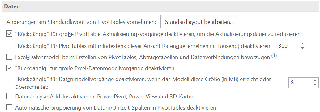 Screenshot zeigt Abschnitt Daten in den Excel-Optionen